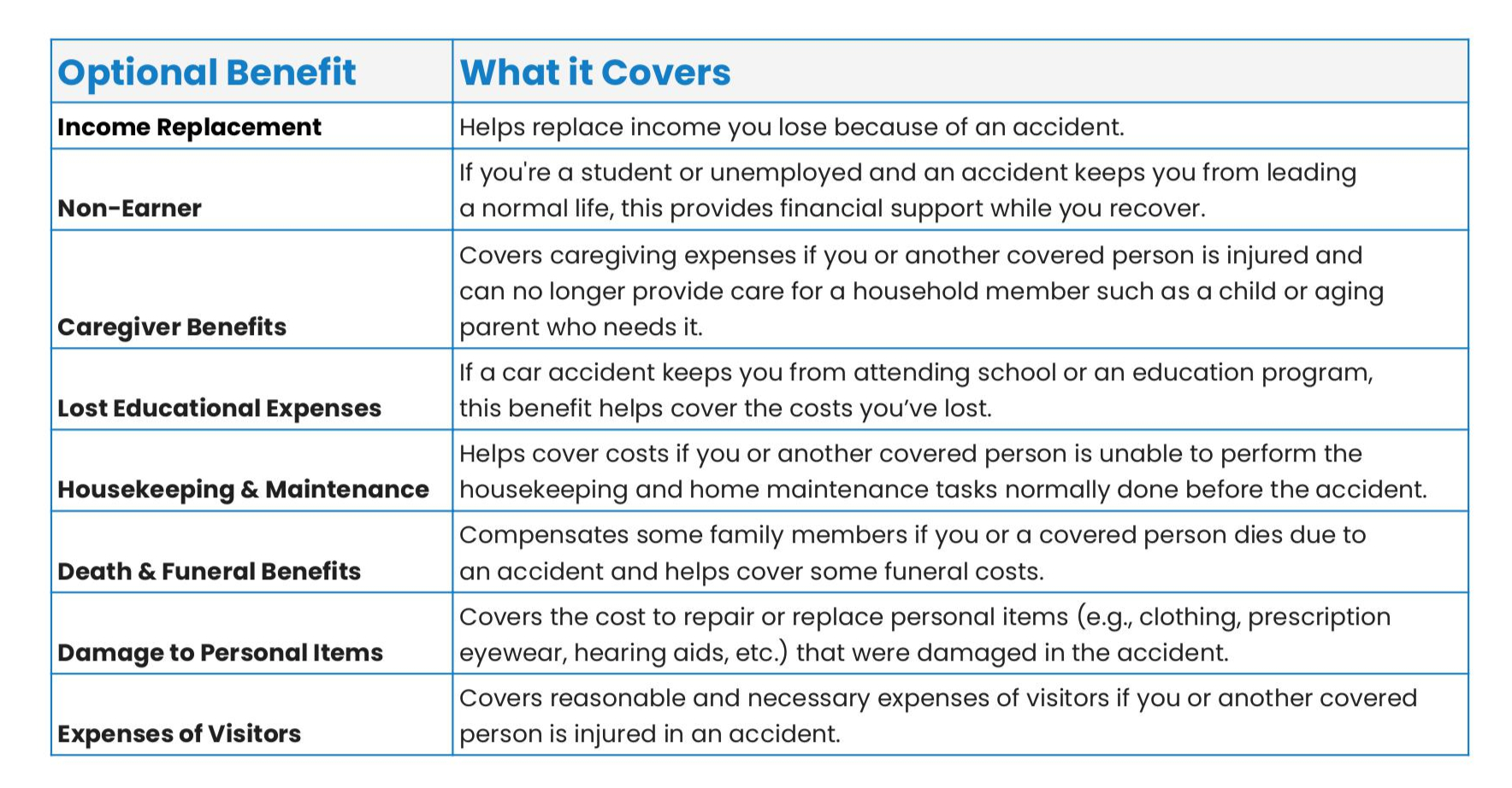 Starting July 1, 2026, new customers may choose which optional accident benefits they would like to purchase. Ask us which benefits are included in your quote. You may want to add optional benefits to your policy based on your needs.